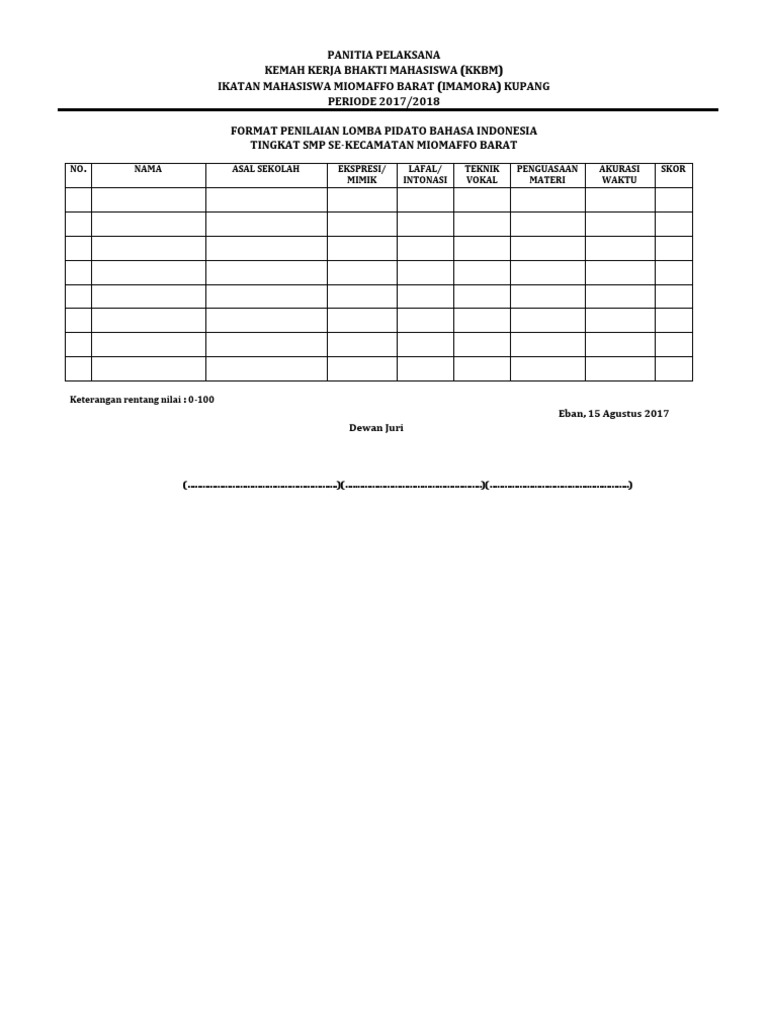 Download contoh form penilaian untuk ujian praktek pidato baik sd smp sma maupun mi mts madrasah aliyah dalam format doc ms word dan excell untuk keemudahan edit dan penjumlahan nilai secara praktis.