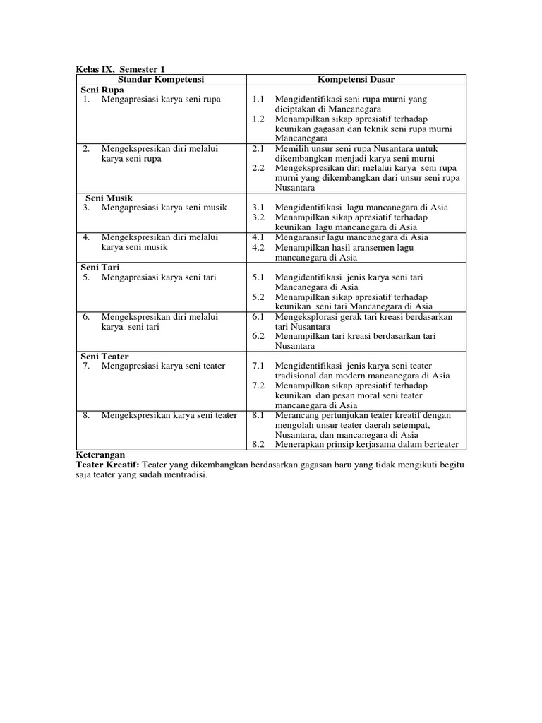 Skl Seni Budaya Smp Kelas 9 : Standar Kompetensi Lulusan Skl Kompetensi Inti Ki Kompetensi / Bagi bapak dan ibu guru yang sedang mencari silabus seni budaya kelas 9 smp kurikulum 2013, maka artikel ini akan sangat bermanfaat buat anda, sebab silabus ini sudah langsung dapat di gunakan.. Pada postingan saya sebelumnya telah saya bagikan perangkat pembelajaran program tahunan lengkap untuk jenjang smp dan khususnya untuk mata pelajaran seni budaya mulai dari kelas vii dan kelas viii. Ki dan kd seni budaya kelas 7 8 9 smp mts k13 tahun pelajaran 2021/2022. Analisis skl, ki dan kd satuan pendidikan : Analisis skl ki kd kurikulum 2013 smp/ mts kelas 7, 8, 9 ini dapat anda dapatkan dengan mendownload link yang sudah saya sediakan dibawah. Smp negeri 1 tembilahan kelas :