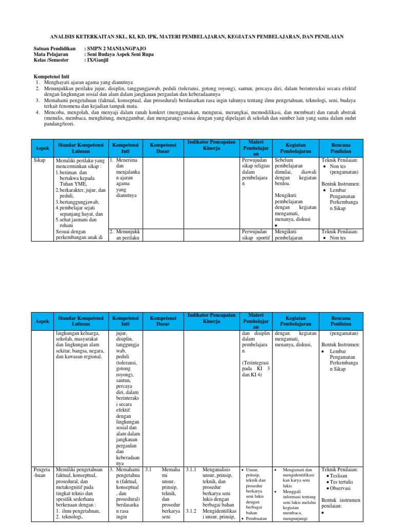 Ki dan kd seni budaya kelas 7 8 9 smp mts k13 tahun pelajaran 2021/2022. Ki dan kd seni budaya kelas 7 8 9 smp mts k13 tahun pelajaran 2021/2022. Download program tahunan seni budaya kelas 9 smp k13 revisi. Perangkat pembelajaran dapat diartikan sebagai sejumlah bahan, alat, media, petunjuk dan pedoman yang akan digunakan dalam proses pembelajaran. Nah bagi bapak/ibu guru yang mengajar pada tingkat satuan pendidikan smp/mts biasanya anda selalu saja disibukkan dengan membuat perangkat pembelajaran seperti silabus, rpp, program.